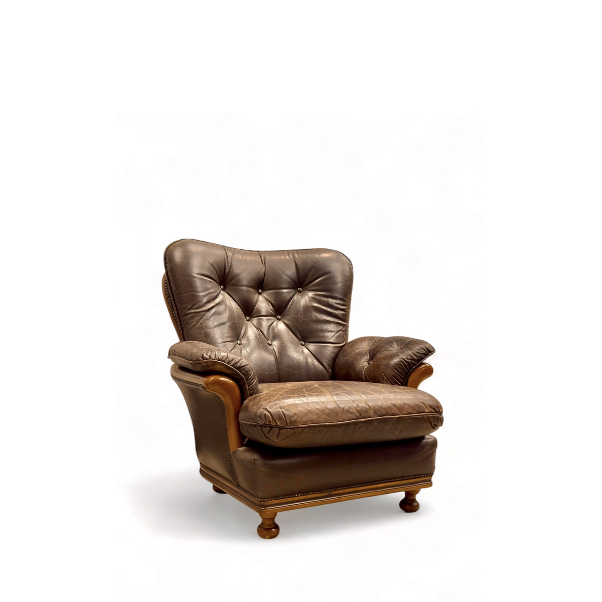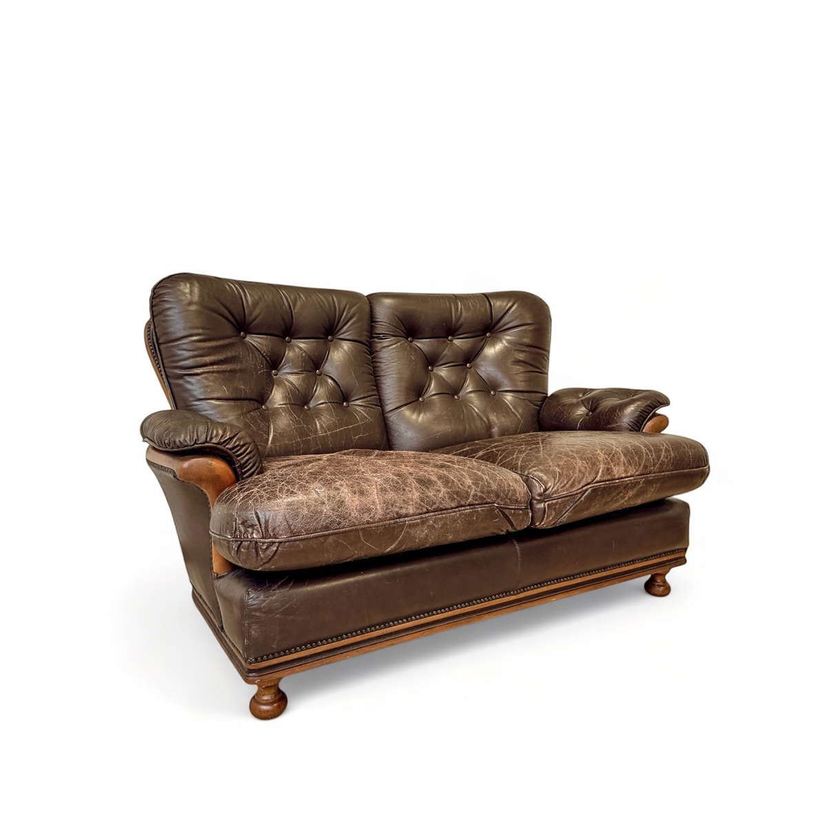 Divano in stile vintage in pelle marrone, da 2 posti, struttura in legno. Ideale per Allestire Eventi e Matrimoni in stile Vintage / Country-Chic e per la creazione di zone lounge in stile.